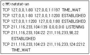 47. Windows 명령 프롬프트 창에서 netstat -an 을 실행한 결과이다. 옳지 않은 것은?(단, 로컬 IP Address는 211.116.233.104 이다.)