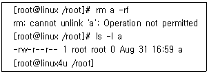 47. Linux에서 root 권한 계정이 'a' 라는 파일을 지우려 했을때 나타난 결과이다. 이 파일을 지울 수 있는 방법은?