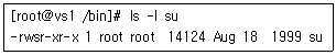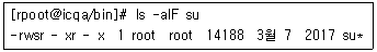 28. Linux에서 su 명령의 사용자 퍼미션을 확인한 결과 ′rws′ 이다. 아래와 같이 사용자 퍼미션에 ′s′ 라는 속성을 부여하기 위한 명령어는?