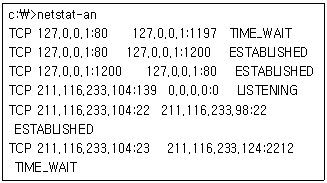 50. Windows 명령 프롬프트 창에서 ′netstat -an′ 을 실행한 결과이다. 옳지 않은 것은?(단, 로컬 IP Address는 211.116.233.104 이다.)