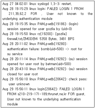 57. 다음은 어떤 시스템의 messages 로그파일의 일부이다. 로그파일의 분석으로 옳지 않은 것은?
