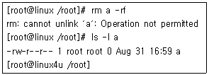 59. Linux에서 root 권한 계정이 ′a′ 라는 파일을 지우려 했을때 나타난 결과이다. 이 파일을 지울 수 있는 방법은?
