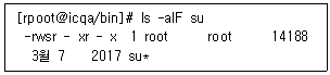 53. 아래와 같이 초기설정이 되어있는 ′/bin/su′ 명령어가 있다. Linux 서버의 내부 보안을 위해 ′/bin/su′ 명령어를 root에게는 모든 권한을, ′wheel′이라는 그룹에게는 실행권한만을 부여하려고 한다. 이 과정 중에 올바르지 않은 사항은?