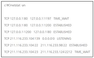 47. Windows 명령 프롬프트 창에서 ′netstat -an′ 을 실행한 결과이다. 옳지 않은 것은?(단, 로컬 IP Address는 211.116.233.104 이다.)