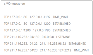 59. Windows 명령 프롬프트 창에서 ′netstat -an′ 을 실행한 결과이다. 옳지 않은 것은?(단, 로컬 IP Address는 211.116.233.104 이다.)