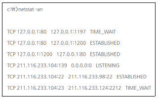 58. Windows 명령 프롬프트 창에서 ′netstat -an′ 을 실행한 결과이다. 옳지 않은 것은? (단, 로컬 IP Address는 211.116.233.104 이다.)