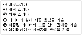 11. 데이터베이스 시스템의 3단계 구조인 내부스키마(Internel schema), 개념스키마(Conceptual schema), 외부스키마(External schema)에 대한 설명의 연결이 옳은 것은?