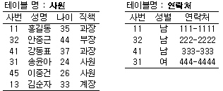 13. 다음 표와 같은 두 테이블에서 성별이 “여”인 사원의 “성명”, “나이”, “직책”을 구하는 SQL문은?
