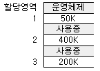 57. 150K의 작업요구시 first fit 과 best fit 전략을 각각 적용할 경우, 할당 영역의 연결이 옳은 것은?