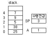 33. 3 다음과 같은 스택(stack) 구조에서 SP(stack pointer)와 레지스터 A가 pop A를 수행한 후 SP와 A 레지스터의 내용은?