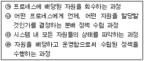 43. 운영체제를 자원 관리자(Resource Manager)라는 관점으로 보았을 때, 자원들을 관리하는 과정을 순서대로 옳게 나열한 것은?