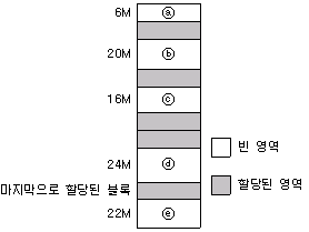 48. 그림과 같은 메모리 구성에서 15M 크기의 블록을 메모리에 할당하고자 한다. ⓒ 영역에 할당시킬 경우 사용된 정책은 무엇인가?
