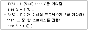 53. 다음은 세마포어와 관련된 두 연산 P(S)와 V(S)이다. ①, ②의 내용으로 옳게 짝지어진 것은?