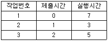 57. 다음과 같은 작업들이 차례로 준비상태 큐에 들어왔다고 가정할 경우, SJF 기법으로 스케줄링 한다면 작업번호 2의 대기시간은?
