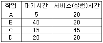 55. HRN방식으로 스케줄링 할 경우, 입력된 작업이 다음과같을 때 우선순위가 가장 높은 것은?