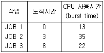 55. FIFO 스케줄링에서 3개의 작업 도착시간과 CPU 사용시간(burst time)이 다음 표와 같다. 이 때 모든 작업들의 평균 반환시간(turn around time)은? (단, 소수점 이하는 반올림 처리한다.)