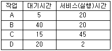 56. HRN 방식으로 스케줄링 할 경우, 입력된 작업이 다음과 같을 때 처리되는 작업 순서로 옳은 것은?