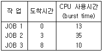 52. FIFO 스케줄링에서 3개의 작업 도착시간과 CPU 사용시간(burst time)이 다음 표와 같다. 이 때 모든 작업들의 평균 반환시간(turn arround time)은?(단, 소수점 이하는 반올림 처리한다.)