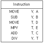 39. 다음 마이크로오퍼레이션을 수행하였을 때 계산되는 수식은?(단, 니모닉 명령어의 덧셈은 ADD, 뺄셈은 SUB, 곱셈은 MPY, 나눗셈은 DIV로, 이동은 MOVE로 정의한다.)