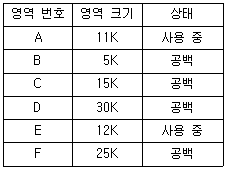 44. 주기억장치 배치 전략 기법으로 First Fit 방법을 사용할 경우, 다음과 같은 기억장소 리스트에서 10K 크기의 작접은 어느 영역에 할당되는가?(단, 탐색은 위에서 아래로 한다.)