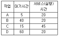 58. HRN 방식으로 스케줄링 할 경우 입력된 작업이 다음과 같을 때 우선순위가 가장 높은 것은?