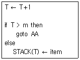 5. 스택 알고리즘에서 T 가 스택 포인터이고, m이 스택의 길이일 때, 서브루틴 “AA”가 처리해야 하는 것은?