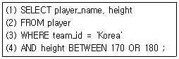 14. 어떤 컬럼 데이터를 조건 검색하는 SQL문에서 틀린 부분은 몇 번째 line인가? (단, 테이블 : player 컬럼 : player_name, team_id, height)