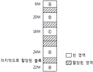 58. 그림과 같은 메모리 구성에서 15M 크기의 블록을 메모리에 할당하고자 한다. ⓒ 영역에 할당시킬 경우 사용된 정책은 무엇인가?