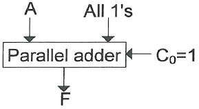 29. 다음의 그림은 병렬 가산기(parallel adder)의 입력과 출력을 나타낸 것이다. 음수 표현을 위해 2의 보수(2‘s complement)를 사용한다고 할 경우 그림은 어떤 연산 수행을 위한 것인가?