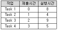 41. 다음 표와 같이 작업이 제출되었을 때, 라운드로빈 정책을 사용하여 스케줄링 할 경우 평균 반환시간을 계산한 결과로 옳은 것은?(단, 작업할당 시간은 4시간으로 한다.)