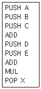 26. 다음은 0-주소 명령어 방식으로 이루어진 프로그램이다. 레지스터 X의 내용은? (단, 레지스터 A=1, B=2, C=3, D=3, E=2 이며, ADD는 덧셈, MUL은 곱셈을 의미한다.)