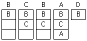 47. 가상메모리의 교체정책 중 LRU(Least Recently Used) 알고리즘으로 구현할 때 그림에서 D 페이지가 참조될 때의 적재되는 프레임으로 옳은 것은? (단, 고정 프레임이 적용되어 프로세스에 3개의 프레임이 배정되어 있고, 4개의 서로 다른 페이지(A, B, C, D)를 B, C, B, A, D 순서로 참조한다고 가정한다.)