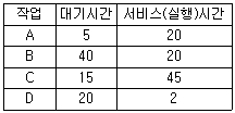 59. HRN 방식으로 스케줄링 할 경우, 입력된 작업이 다음과 같을 때 처리되는 작업 순서로 옳은 것은?