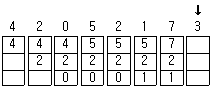 60. LRU 교체 기법에서 페이지 프레임이 3일 경우 페이지 호출 순서가 3인 곳(화살표 부분)의 빈 칸을 위에서부터 아래쪽으로 옳게 나열된 것은?