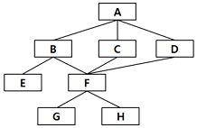 68. 다음은 어떤 프로그램 구조를 나타낸다. 모듈 F에서의 fan-in과 fan-out의 수는 얼마인가?