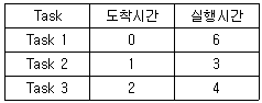 44. 다음과 같은 Task List에서 SJF방식으로 Scheduling할 경우 Task 2의 종료 시간을 구하면? (단, 발생되는 Overhead는 무시한다.)
