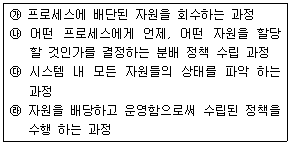 52. 운영체제를 자원 관리자(Resource Manager)라는 관점으로 접근했을 때, 자원들을 관리하는 과정을 순서대로 가장 옳게 나열한 것은?