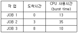 58. FIFO 스케줄링에서 3개의 작업 도착시간과 CPU 사용시간(burst time)이 다음 표와 같다. 이 때 모든 작업들의 평균 반환시간(turn around time)은? (단, 소수점 이하는 반올림 처리한다.)