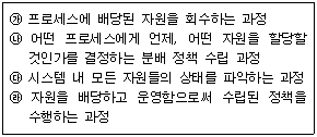 69. 운영체제를 자원 관리자(resource manager)라는 관점으로 보았을 때, 자원들을 관리하는 과정을 순서대로 옳게 나열한 것은?