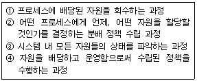 69. 운영체제를 자원 관리자(resource manager)라는 관점으로 보았을 때, 자원들을 관리하는 과정을 순서대로 옳게 나열 한 것은?