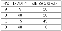 72. HRN 방식으로 스케줄링 할 경우, 입력된 작업이 다음과 같을 때 우선순위가 가장 높은 것은?