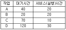 69. HRN 방식으로 스케줄링 할 경우, 입력된 작업이 다음과 같을 때 우선순위가 높은 순서부터 차례로 옳게 나열한 것은?