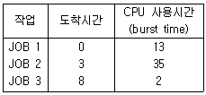 65. FIFO 스케줄링에서 3개의 작업 도착시간과 CPU 사용시간(burst time)이 다음 표와 같다. 이 때 모든 작업들의 평균 반환시간(turn around time)은? (단, 소수점 이하는 반올림 처리한다.)