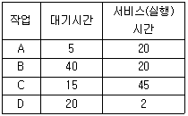 71. HRN 방식으로 스케줄링 할 경우, 입력된 작업이 다음과 같을 때 우선 순위가 가장 높은 것은?