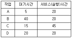 74. HRN 방식으로 스케줄링할 경우, 입력된 작업이 다음과 같을 때 우선순위가 가장 높은 것은?