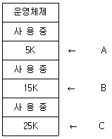 72. 주기억장치 배치 전략 기법으로 최초 적합(First Fit) 방법을 사용한다고 할 때, 다음과 같은 기억장소 리스트에서 10K 크기의 작업은 어느 기억공간에 할당되는가? (단, 탐색은 위에서 아래로 한다.)