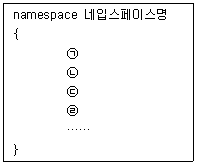 12. 다음은 프로그램에서 이름이 유효한 범위를 한정하는 namespace의 기본형태이다. ㉠~㉣에 들어갈 내용의 순서를 올바르게 나열한 것은?