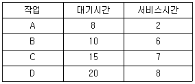 62. HRN(Highest Response-ratio Next) 방식으로 스케줄링할 경우, 입력된 작업이 다음과 같을 때 우선 순위가 가장 높은 작업은?