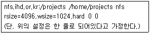 75. NFS 클라이언트에서 NFS 서버(nfs.ihd.or.kr)의 /projects 디렉토리를 마운트하기 위해 /etc/fstab 파일에 다음의 내용을 넣었다. 이에 대한 설명으로 적절하지 않은 것은?