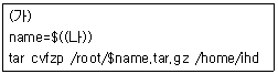 11. /home/ihd 디렉토리를 /root 디렉토리에 tar.gz 형식으로 백업을 받기 위한 backup.sh 쉘 스크립트 파일을 만들고, 이 파일을 cron 데몬을 이용하여 하루에 한번씩 주기적으로 실행 시키려고 한다. 다음은 이를 위한 backup.sh 파일의 내용으로, (가)와 (나)에 알맞은 것을 고르시오.